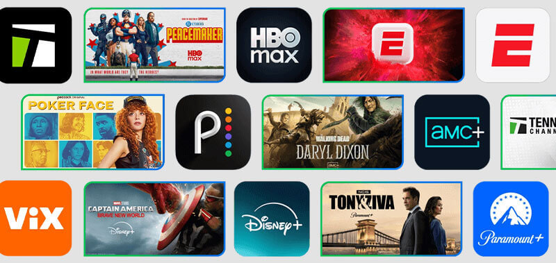 - HBO Max Basic With Ads, Hulu, ESPN Unlimited, Disney+, Paramount+ Essential, AMC+ with Ads and ViX Premium with Ads